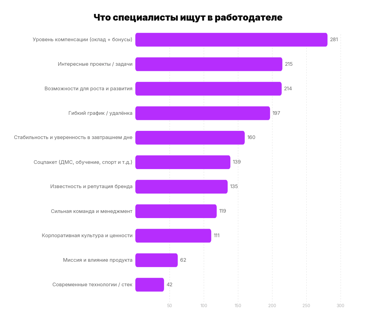 Интересно, что репутация бренда работодателя и миссия продукта тоже играют заметную роль. Многие специалисты обращают внимание на то, какое место компания занимает на рынке, какой продукт она делает и насколько этот продукт близок им лично.