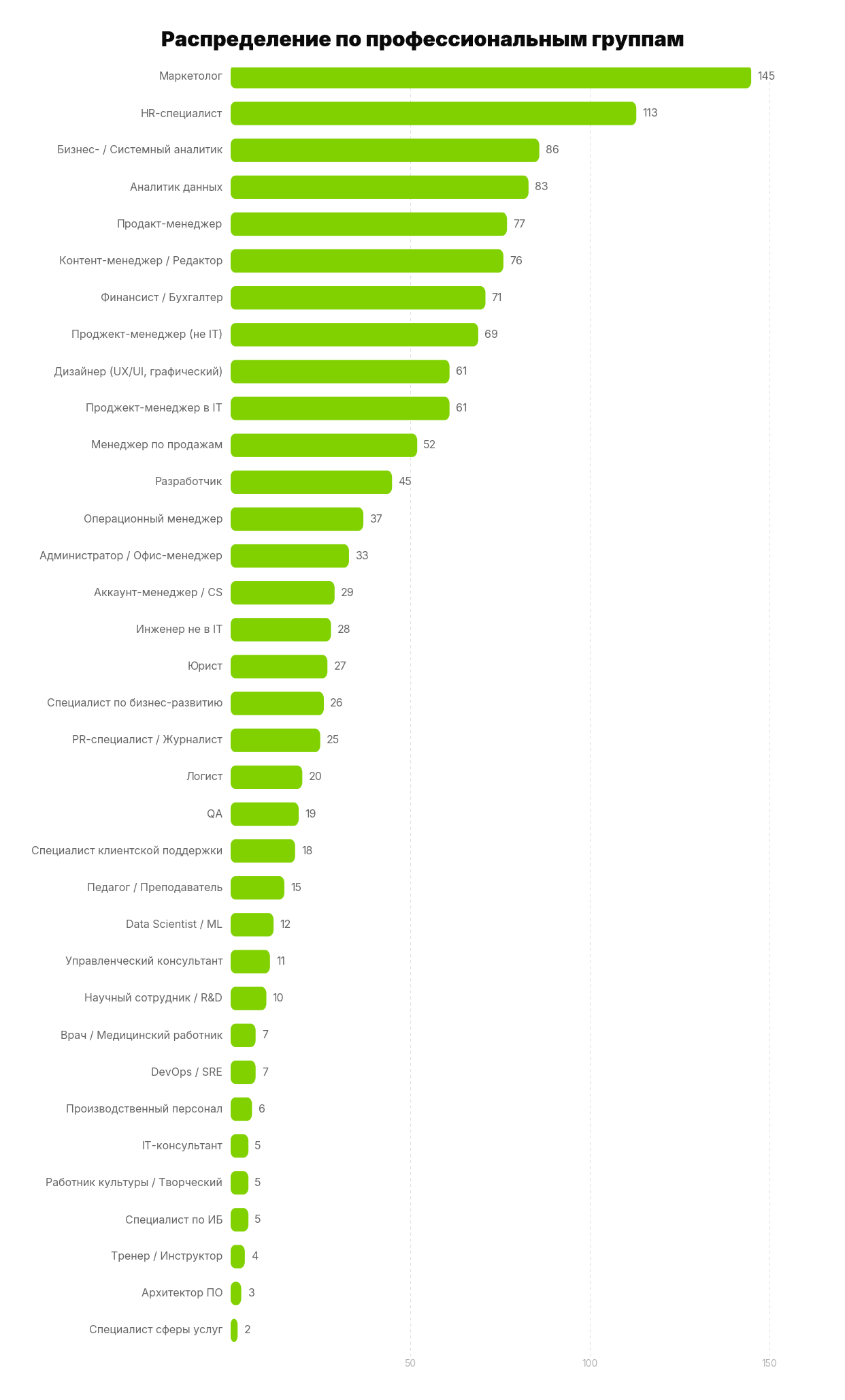Это важно, чтобы понимать, за счёт кого формируется общая картина и почему мы можем доверять фактам, полученным в ходе исследования. Вот как распределились участники по крупным профессиональным группам.