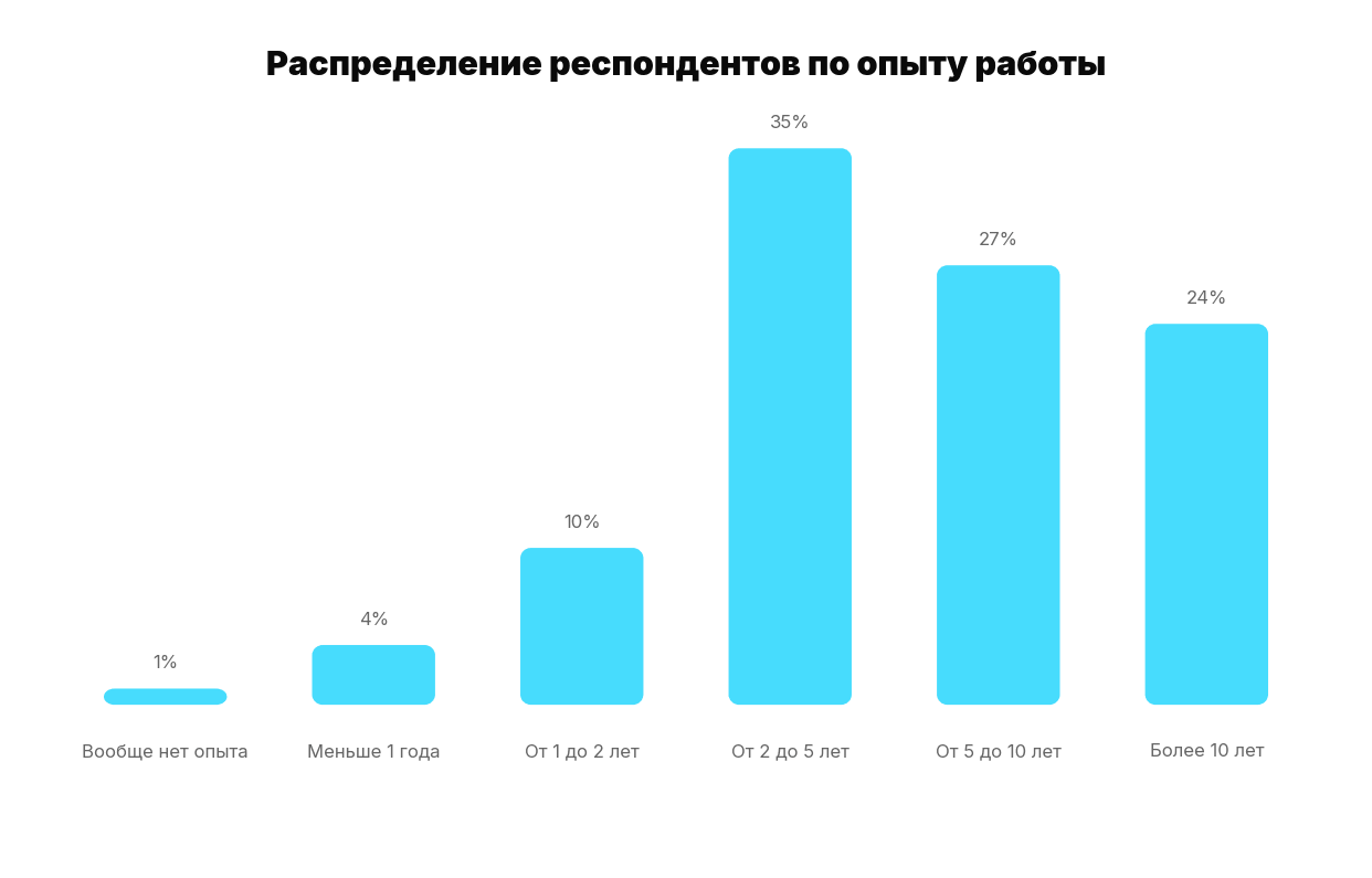 Чтобы рейтинг получился честным и отражал не только мнение узкого круга, мы собрали максимально широкую аудиторию. В опросе приняли участие 1 295 специалистов — от начинающих до профессионалов с десятилетним стажем. Выборка собиралась так, чтобы в ней были представлены все ключевые профессиональные группы и географические сегменты: от разработчиков и аналитиков до маркетологов и HR, от Москвы до регионов.