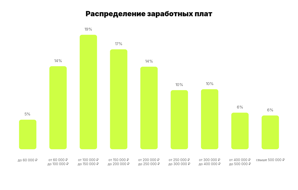 По доходу картина типичная для специалистов среднего и старшего уровня. Самая популярная вилка — от 100 000 до 150 000 рублей, солидные доли у диапазонов 60 000–100 000 и 150 000–200 000 рублей. Но есть в выборке и те, кто зарабатывает от 300 000 и выше — мы сможем посмотреть, чего хотят самые разные кандидаты.